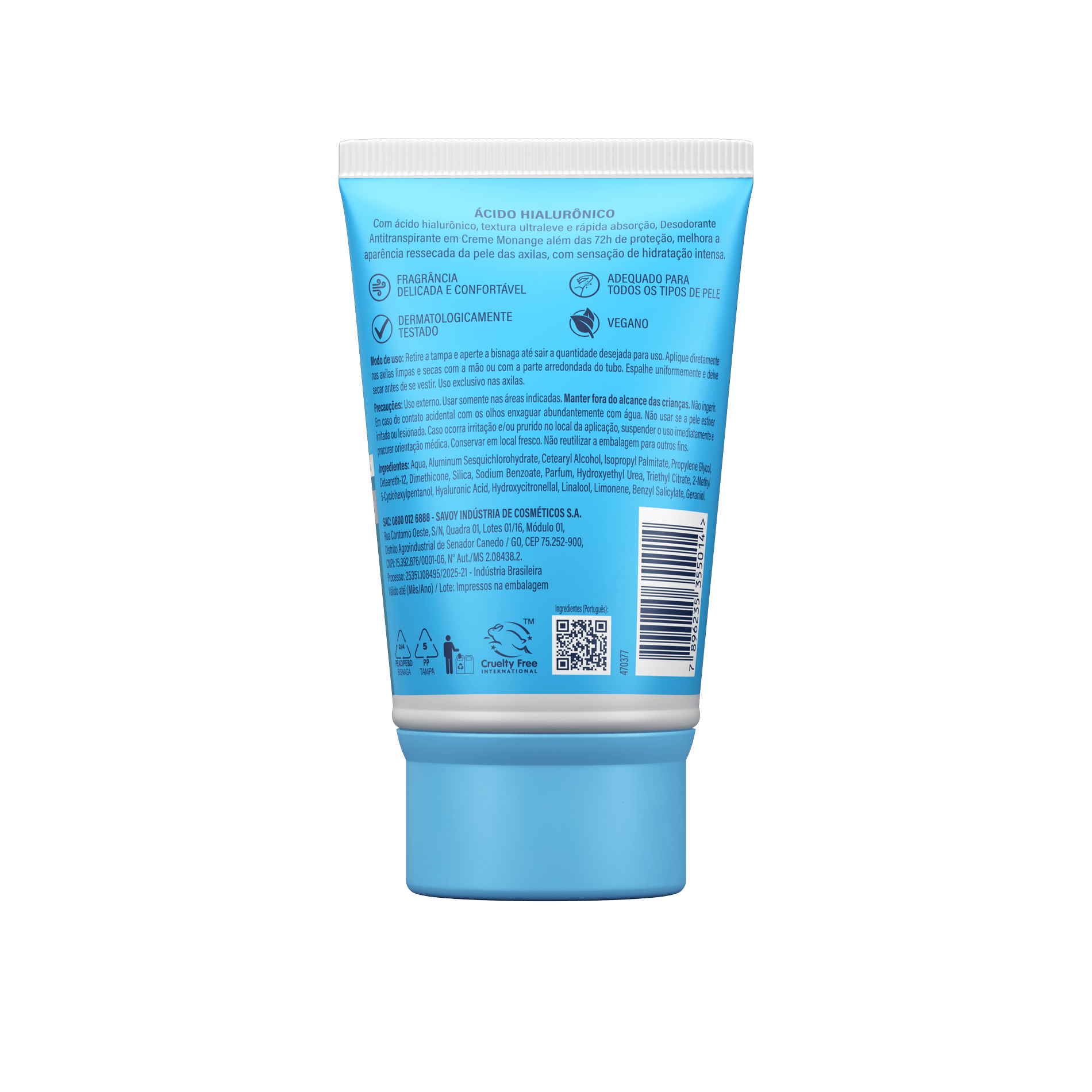 O Desodorante em Creme Monange com Ácido Hialurônico conta com 72h de proteção contra suor e odor e promove hidratação imediata das axilas. Possui textura ultraleve e não pegajosa, sendo dermatologicamente testado para todos os tons de pele. Combate o ressecamento, melhora a firmeza e aparência da pele. Conheça a linha completa dos desodorantes em creme!