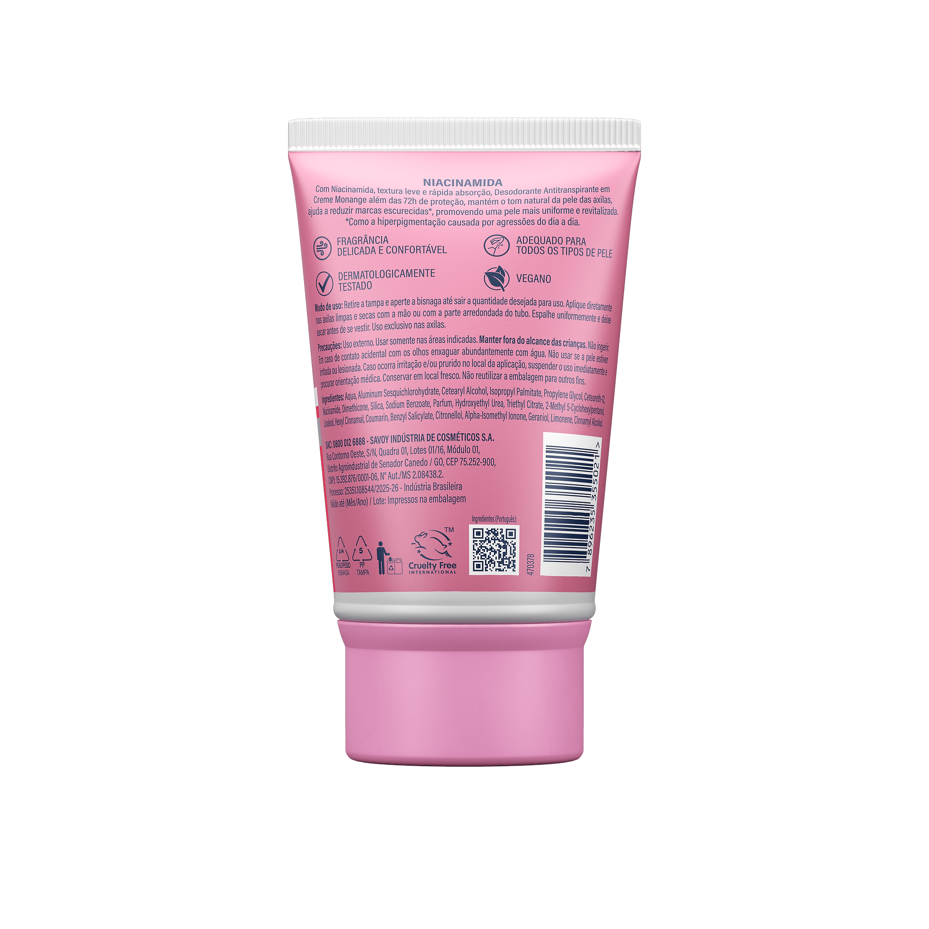 O Desodorante em Creme Monange com Niacinamida conta com 72h de proteção contra suor e odor e uniformiza o tom da pele. Possui textura leve e não pegajosa, sendo dermatologicamente testado para todos os tons de pele. Sua fórmula ajuda a clarear axilas escurecidas em até 4 semanas de uso*, sem ressecar as axilas. Conheça a linha completa dos desodorantes em creme! *Resultados obtidos através de estudo clínico realizado com consumidoras durante 28 dias de uso contínuo.