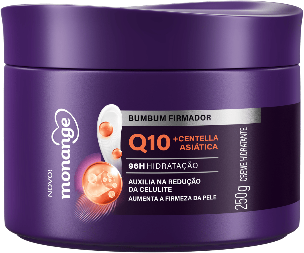O Hidratante Monange Bumbum Firmador Q10 com Centella Asiática 250g é ideal para a área dos glúteos e possui até 96 horas de hidratação. Com fórmula enriquecida com Centella Asiática, ele aumenta a firmeza da pele e auxilia na redução da celulite em 28 dias de uso contínuo*. A Centella Asiática proporciona ‘Efeito Drenagem’, que melhora a aparência e proporciona um bumbum com textura mais lisinha e uniforme. Além disso, o Hidratante Monange Bumbum Q10 já é aprovado pelas consumidoras: 100% afirmam que o produto proporciona uma textura de pele lisa**. Conheça toda a linha de Firmadores Q10 Monange!